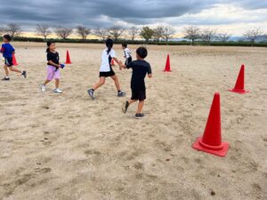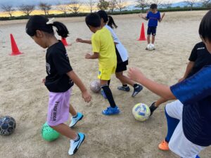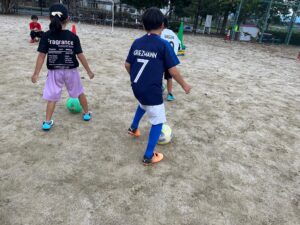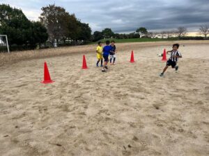 練習メニューは、鬼ごっこ・囲み鬼ごっこ・ボール出しゲーム・ボールタッチ・ダイレクトシュート・ドリブルシュート・試合⚽️